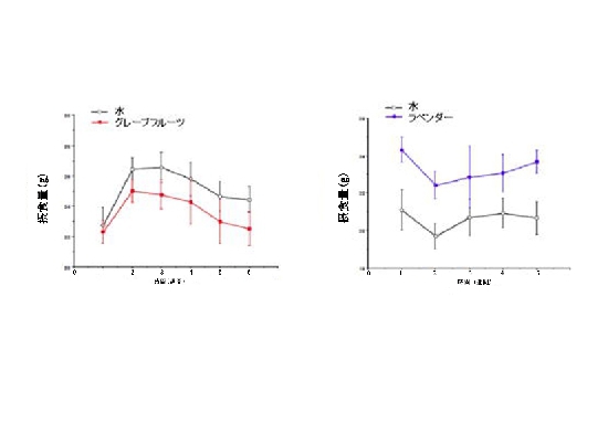 食餌摂食量は対象に水刺激群と比較して、グレープフルーツ精油の匂い刺激群では刺激開始3週目から有意に減少し、ラベンダー精油の匂い刺激群では、刺激開始直後から有意に増加しました。